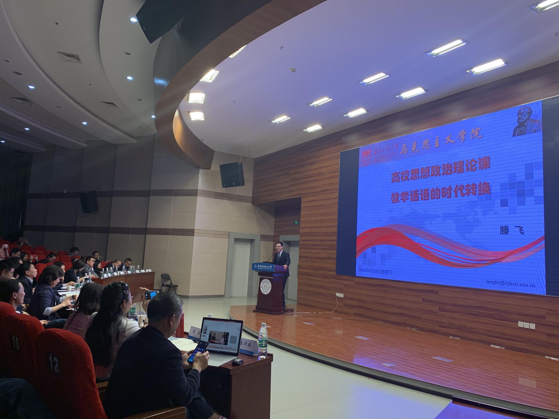 公司经理助理、思想道德修养兼法律基础教研室主任滕飞老师受邀作为江苏高校优秀青年教师代表做了题为“高校思想政治理论课教学话语的时代转换”的主题发言。他分析了当前高校思想政治理论课教学的“失语”现象及其成因;着重探讨了高校思想政治理论课教学话语转换的路径——文本话语向生活话语的转换,独白话语向对话话语的转换,灌输话语向情感话语的转换,传统话语向现代话语的转换,理论话语向实践话语的转换;强调了高校思想政治理论课教学话语转换的边界——扎根生活也要坚持政治原则,话语生动仍要保持价值理性,通俗易懂但是不能庸俗媚俗,实践教学不能代替理论讲授。