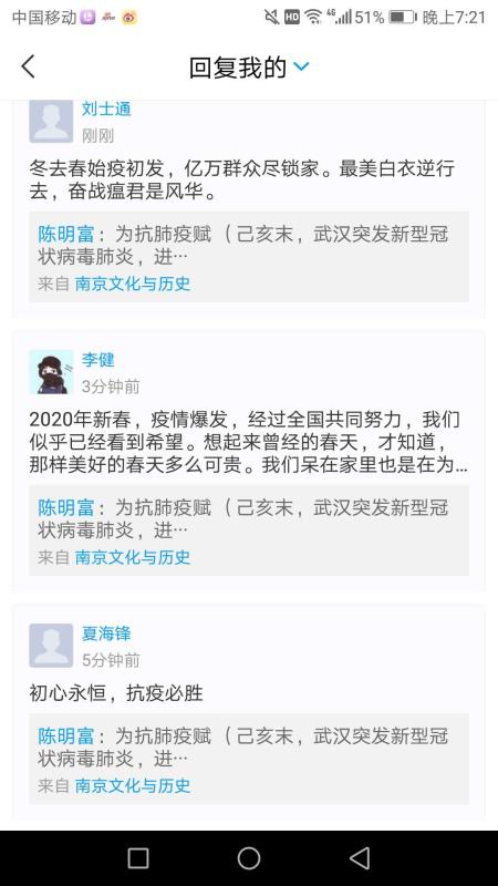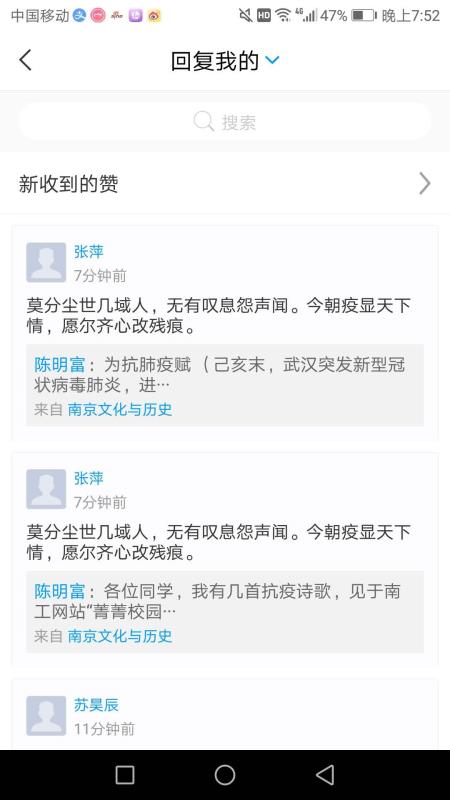 3月19日晚,陈明富老师在给电子类和计算机19级的员工进行《南京文化与历史》的线上教学时,发布了自己日前新作的《为抗肺疫赋》、《庚子春抗疫感赋五首》等,迅速引发员工热烈互动。在陈老师的启发、鼓励下,张萍、刘士通等同学也勇敢地赋诗抒发爱国情怀。