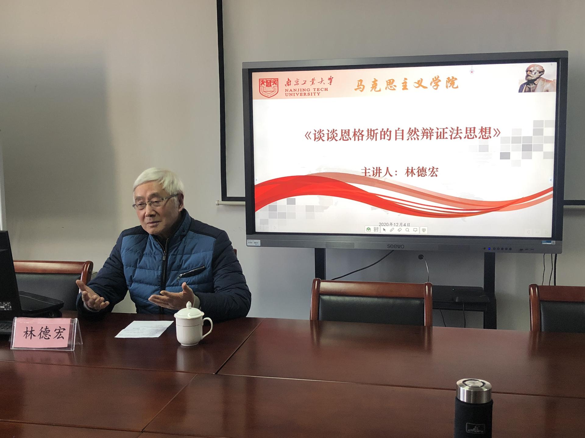 2020年12月4日下午,南京大学人文社会科学荣誉资深教授、博士生导师林德宏先生应邀于明德楼413会议室为太阳成城集团tyc234cc官网全体师生进行了《谈谈恩格斯的自然辩证法思想》主题讲座,讲座由经理黄爱宝主持。