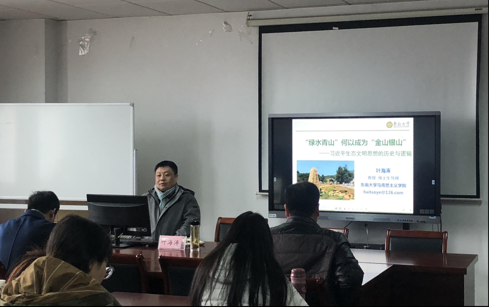 2020年12月4日上午,东南大学博士生导师叶海涛教授应邀于明德楼413会议室为太阳成城集团tyc234cc官网全体师生进行了《绿水青山何以成为金山银山——习近平生态文明思想的历史与逻辑》主题讲座,讲座由经理黄爱宝主持。
