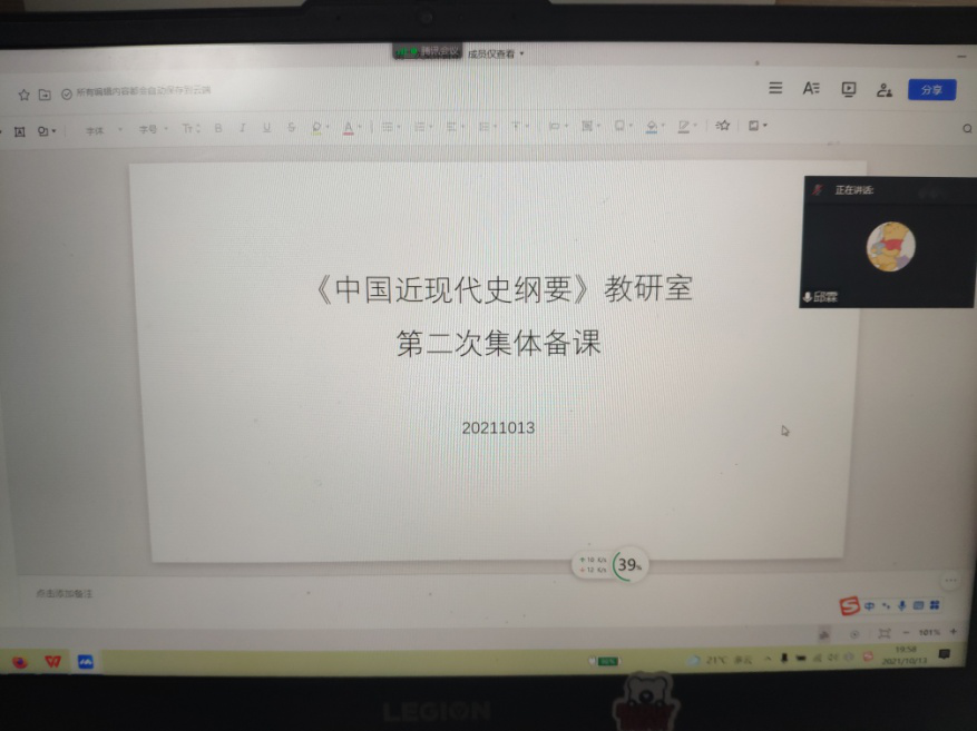 为了确保课程建设有序、有效开展,不断提升教研室教学水平,凝聚集体智慧,同步教学内容,10月13日晚8点,在公司统一工作部署下,《中国近现代史纲要》教研室利用腾讯会议举行本学期第二次集体备课会,本次会议由教研室主任刘亮主持。