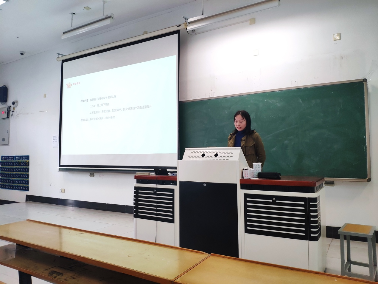 课程建设带头人刘亮、朱丽晖携课程组全体老师参加活动。活动由刘亮老师主持。在说课环节,每位教师阐述了教学内容以及教学设计,着重就教学方法和具体案例做了介绍。与会新任老师还以抗美援朝的意义、十一届三中全会召开的历史背景等为题进行试讲。陶然、刘亮、朱丽晖等老师对试讲老师的表现给予了充分肯定,并就每位老师的教学组织、教学方式方法以及课堂表现等作了逐一点评。新任教师表示,通过这次交流会,收获颇深,进一步认识到教学中存在的不足,特别是要从细节入手,做到认真严谨。