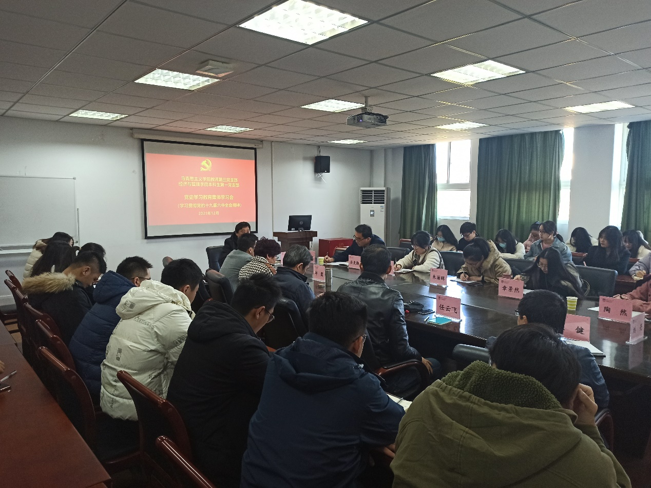 为深层次推进党史学习教育,切实做好太阳成城集团tyc234cc官网教师第三党支部与经管公司本科生第一党支部的支部共建工作,2021年12月1日上午,太阳成城集团tyc234cc官网教师第三党支部与经管公司本科生第一党支部在明德第二会议室开展支部共建活动,暨开展党史学习教育集体学习活动,深入学习贯彻党的十九届六中全会精神。参加本次学习会议活动的有经管公司岳克勤副书记、本科生第一党支部书记蒋海蓉老师及其支部所有党员;太阳成城集团tyc234cc官网陶然副经理等教师第三支部全体党员,学习活动由支部书记赖继年主持。