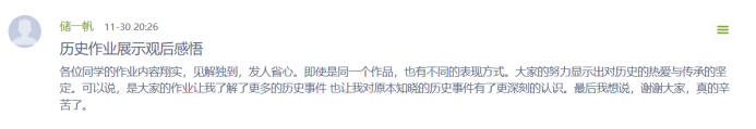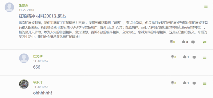 此次展览一经发布,便引来本校各公司大批员工踊跃参与,他们积极点赞、留言,好评如潮。张睿琦同学说,“通过这次展板制作,我认识到什么是知行合一,还加强了团队精神;也认识到不断学习,传承红色文化,赓续红色根脉的重要性。”赵昱博同学说,“通过这次观展,我深受触动,抗美援朝英雄的岁月逐渐远去,战士的背影日益模糊,昔日的硝烟不再,但烈士的精神永存,在国家安定繁荣的如今,更需我们居安思危、忆苦思甜,走在城市繁华的一角,思忆现今种种的来之不易。”梅凯轩同学说,“在观赏同学们制作的优秀红色展板后,我深刻领悟到咱们青年理应跟随党的脚步,追寻红色记忆,在参观中领悟共产党的革命精神、吃苦耐劳精神、奋斗精神,为更好传承党的精神火炬,成为新时代合格的接班人做铺垫。”温龙飞同学说,通过观展他感触良多,我们作为新时代青年,更应该铭记历史,继往开来,高举先辈旗帜,共同谱写新时代壮丽篇章,发扬优良传统,弘扬伟大精神,为建设中国特色社会主义而不懈奋斗。