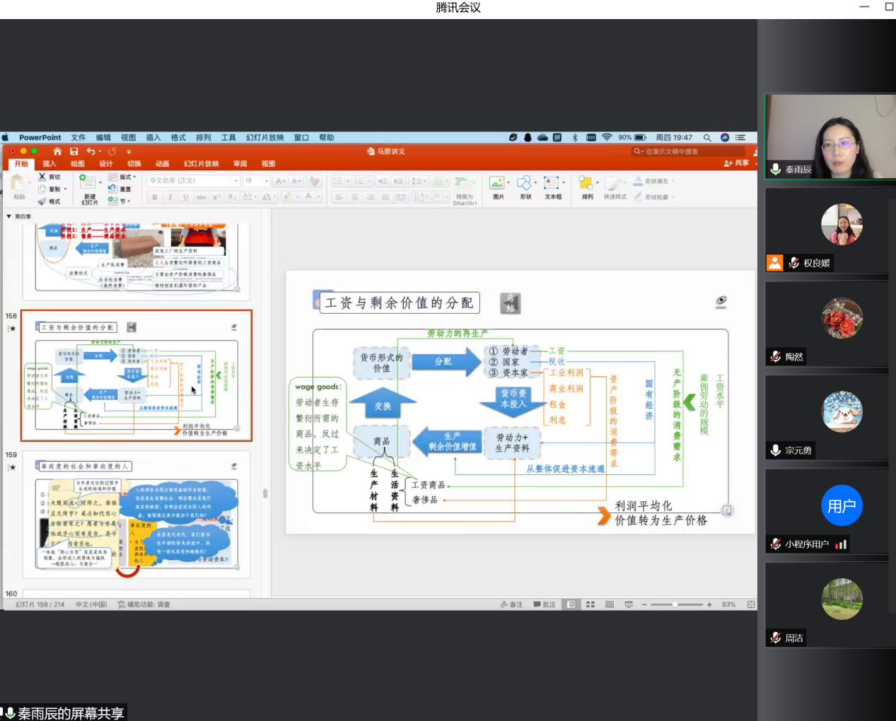 随后,由秦雨辰、周洁两位教师进行教学展示。秦老师分享了自己的教学案例和课件,展示了教学环节中的特色做法,分析了在教学过程中遇到的困惑和问题。其围绕青年员工的特点、需要以及自身的研究重点、学术专长等开展专题设计,在教学相长中引导员工进行研究性学习。周老师则以“商品经济和价值规律”专题为例展开教学案例分析,并结合自身学科背景、教学感受和教学思路同与会教师作深入交流。