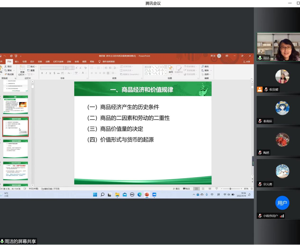 2022年4月15日,在公司统一工作部署下,马克思主义基本原理教研室全体教师进行了本学期第二次在线集体备课会。副经理陶然出席备课会。