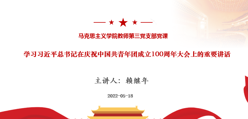 2022年5月18日上午,公司教师第三党支部在民德楼第二会议室开展题为“学习习近平总书记在庆祝中国共青年团成立100周年大会上的重要讲话”的主题党课学习活动。太阳成城集团tyc234cc官网第三党支部全体党员参加了本次学习活动。