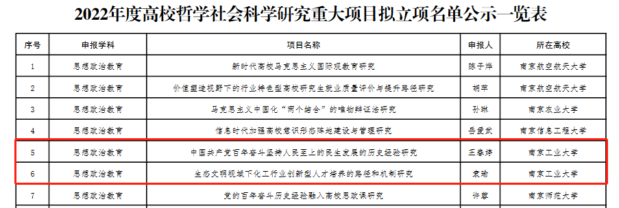 近日,江苏省教育厅发布《2022年度江苏高校哲学社会科学研究重大项目拟立项名单公示》,依托公司申报的两项思政专项获得立项,分别是王春婷教授的《中国共产党百年奋斗坚持人民至上的民生发展的历史经验研究》和袁瑜博士的《生态文明视域下化工行业创新型人才培养的路径和机制研究》。