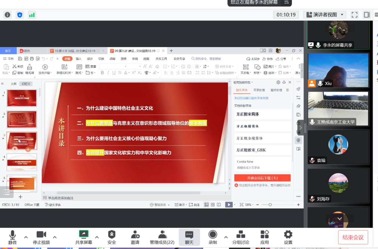 2022年10月19日,在公司统一工作部署下,《概论》课教研室召开本学期第三次集体备会。本次集体备课会重点学习习近平新时代中国特色社会主义思想。首先,王焕成老师领学“习近平新时代中国特色社会主义思想概论”课的PPT课件的第七、八专题,李永老师领学“习近平新时代中国特色社会主义思想概论”课的PPT课件的第九、十专题。其次,张秀勤老师传达了公司及公司关于上好“习近平新时代中国特色社会主义思想概论”课的要求。要求任课老师认真学习课件内容,确保讲准讲透讲深教学内容。另外,上周三刘海存、李永两位老师分别领学“习近平新时代中国特色社会主义思想概论”课的PPT课件的第三和四专题、第五和六专题。
