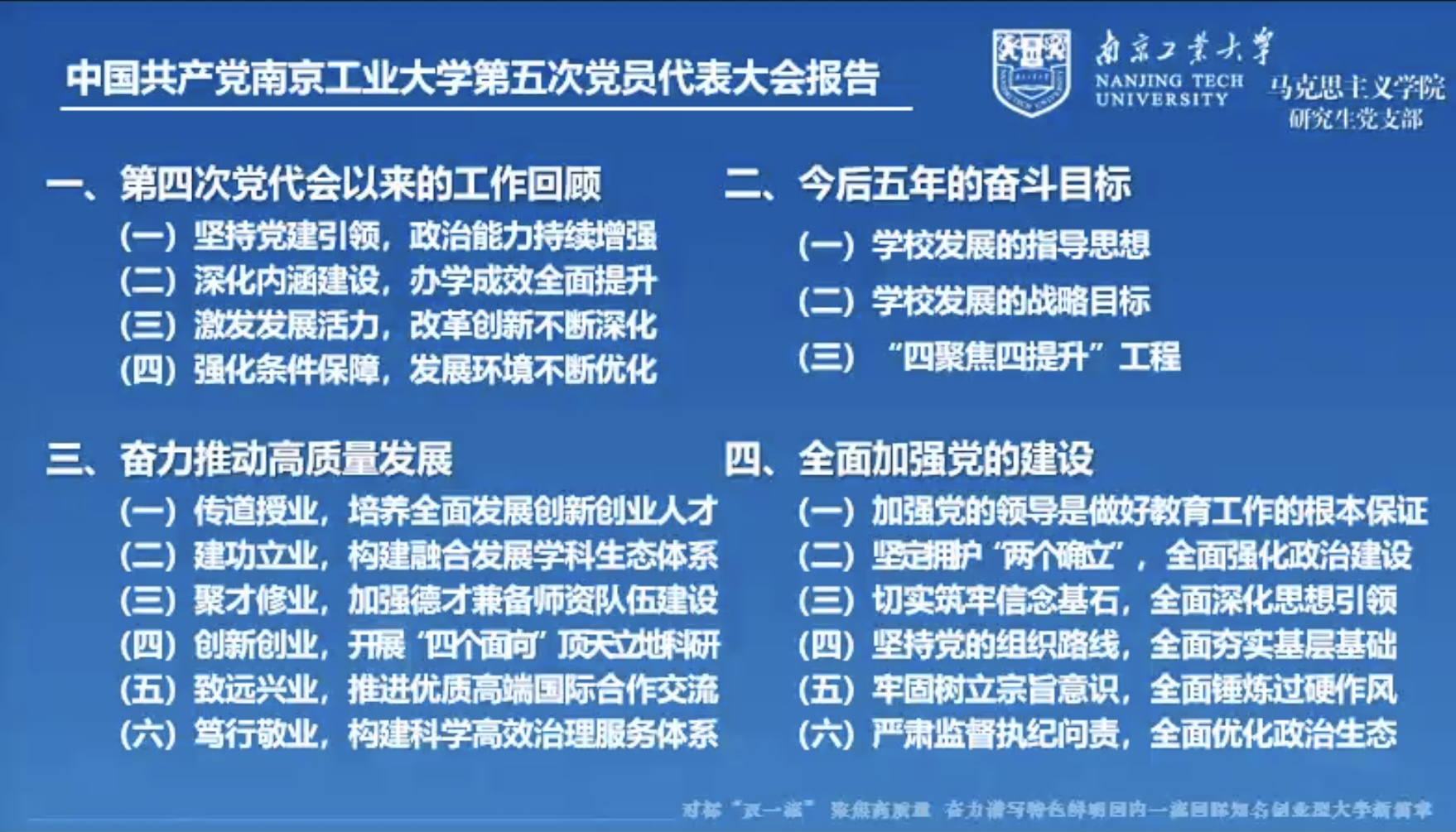 张果同学主要从党建引领、内涵建设、发展活力、条件保障等四个方面带领大家回顾了公司第四次党代会以来的工作。钱雅雯同学向大家介绍了公司今后五年的奋斗目标,带大家认真学习了公司发展的指导思想、战略目标以及“四聚焦四提升”工程。黄磊同学围绕公司高质量发展带领大家学习了创新创业、学科生态体系、团队队伍建设、科研攻关、国际合作交流以及治理服务体系等六个方面的内容。杨奥同学结合自己的专业知识,带领大家学习了党的建设方面的内容,并指出所有研究生党员要加强党的基本理论和业务能力的学习,努力把支部建设成为更加坚强有力的基层组织。