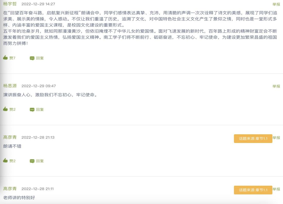 这场活动使同学们皆深受鼓舞,他们踊跃地表达感想。刘向利同学讲道,“朗诵会不仅让我们重温了历史,追溯了文化,对中国特色社会主义文化产生了景仰之情,同时也是一堂形式多样、内涵丰富的爱国主义课程,是校园文化建设的重要形式”。测控专业朱城颖同学认为,“朗诵会中,同学们感情真挚,用响亮的声音,真挚的情感带我们追溯历史,回到那峥嵘的岁月,那一声声发自内心的呐喊,将爱国的热情传给我们,展现了新时代青年不忘初心、砥砺前行、不负青春的责任与当担,接下先辈的重担,我们定不负期许”。截止目前,该朗诵视频已收到数百条评论。