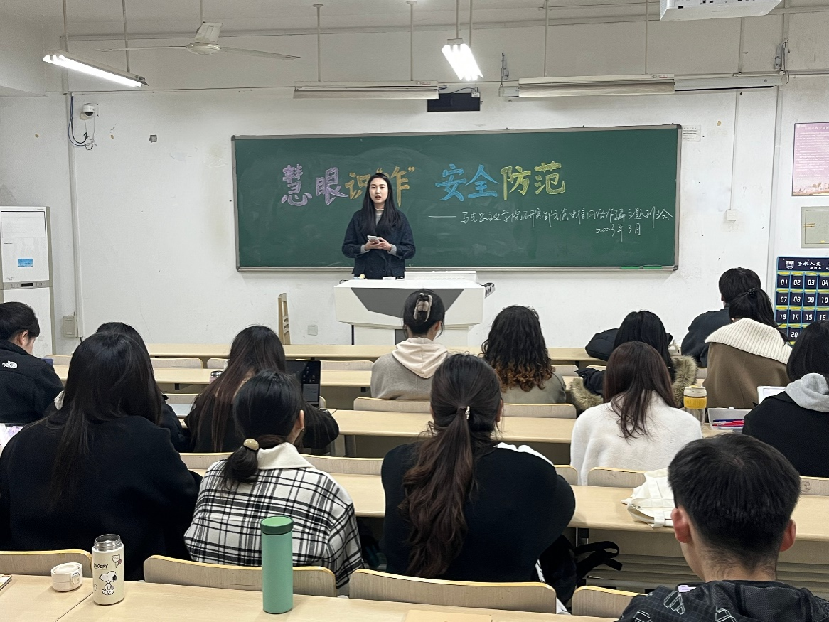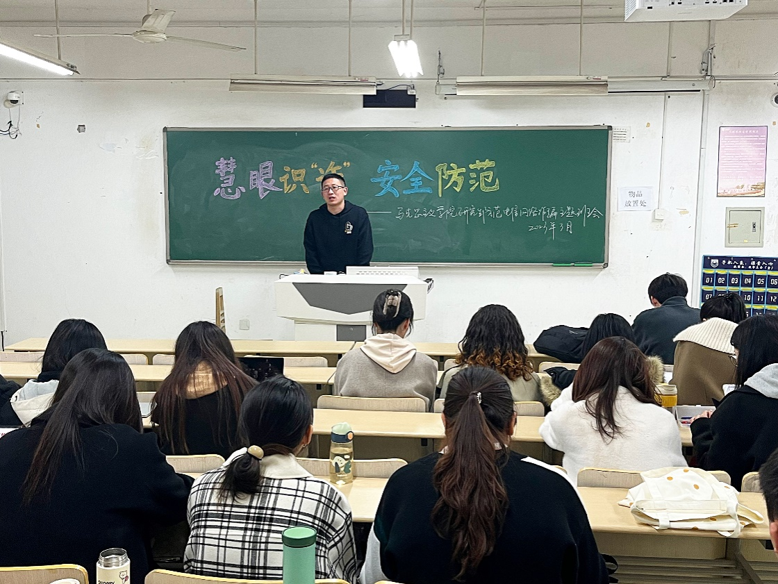 本次班会以《慧眼识“诈”,安全防范》为主题,旨在提高同学们防范电信网络诈骗意识和能力,预防和减少电信网络诈骗案件的发生,做阳光健康的研究生。班会上,曹馨升同学以近期发生的电信诈骗案件引入主题,为大家揭开诈骗组织的作案套路;接着,卜宇同学就诈骗的种类——兼职刷单、冒充客服、网络博彩、虚假中奖和脱离平台线下交易等具体展开介绍,结合案例分析、视频揭秘等方式全面直观地揭开各种骗术骗局;最后,全体硕士研究生阅读《“八个凡是”——谨防电信网络诈骗安全倡议书》,同学们纷纷表示通过本次防范电信网络诈骗主题班会自身受益匪浅,将牢固树立个人防范意识,自觉向亲友普及防诈知识,防患于未然。
