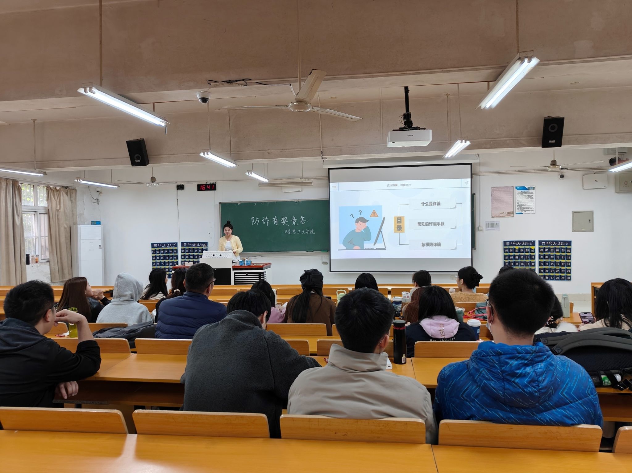 活动中,主持人先向同学们讲解反诈知识,介绍诈骗案例。竞答题目内容广泛,包括了常见电信诈骗类型、防范措施、案例模拟、举报电话以及电信诈骗的现状等多个方面。