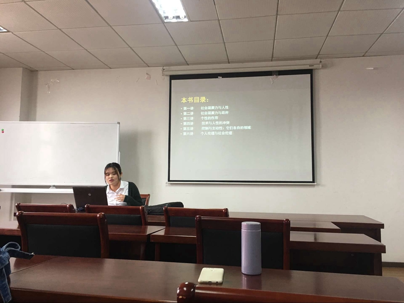 研二同学孙继芹率先发言,她以经典著作《红楼梦》中王熙凤的管理案例切入,对如何高效实践现代化管理、危机公关做了精辟的阐述,并引发了同学间激烈的讨论;研二同学李喆带着导师推荐书目《于丹论语心得》和同学们做了分享,论语是我国经典名著,李喆同学以辩证的视角,理性的分析了论语在当代社会的现实意义和历史局限;研一陈晖同学则针对政治学课程带来了罗素的《权威与个人》,并就书中阐述的内容提出启发性问题。