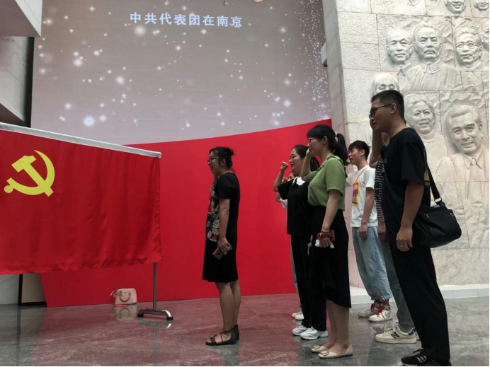 南京“梅园新村”是周恩来为代表的中共代表团曾经工作和生活的地方,这段历史是中国共产党百年历史中不可或缺的重要篇章。梅园新村纪念馆由中共代表团办事处旧址、国共南京谈判史料陈列馆、周恩来铜像、周恩来图书馆等组成。步入国共南京谈判史料陈列厅,正中一面大型汉白玉浮雕和庄严的党旗,浮雕上雕刻了中共代表团领导成员和部分工作人员的群像。面对庄严的党旗,在革命先辈的浮雕下,第三教师党支部和研究生党支部党员,重温对党忠诚而神圣的誓言。教育自身时刻牢记入党誓言,不忘入党初心,努力争做合格党员。当入党誓词一句一句地响起,党员们又一次重温了入党时对党和人民作出的庄严承诺,那份永远跟党走,为党和人民的事业而奋斗的思想信念更加坚定了。同时,教师第三支部和研究生支部为今年上半年过政治生日的党员集体过了一次“政治生日”,向他们赠送了政治生日贺卡,进一步激励和引导党支部党员寻初心、守初心、践初心,动员立足岗位建功立业,锤炼党性,同时两名6月过“政治生日”的党员代表分别畅谈了自己的入党经历和入党以来的心路历程,并许下了生日愿望,其他党员也纷纷向本次过政治生日的党员送去生日祝福和希望。教师支部的老师同时以纪念馆为课堂、以历史为教材,向员工支部现场讲授了国共两党重庆谈判及南京谈判的艰辛。