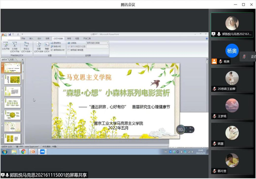 为贯彻落实《教育部等八部门关于加快构建高校思想政治工作体系的意见》中传达出的加强疫情封校期间研究生心理健康教育的信号,同时响应太阳成城集团tyc234cc官网“通达‘研’旅,‘心’好有你”首届研究生心理健康节的号召,2022年5月25日上午,公司通过腾讯会议平台开展“森想·心想”小森林心理电影赏析活动。本次电影赏析活动由公司心理气象员郭凯悦同学主持,全体研究生参加活动。